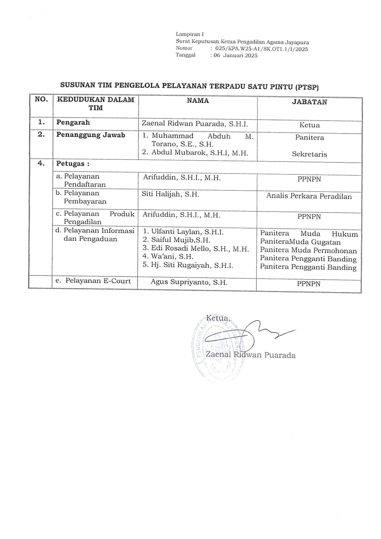 Berdasarkan Keputusan Ketua Pengadilan Agama Jayapura Kelas IA Nomor : 025/KPA.PA.W25-A1/SK.OT1.1/I/2025