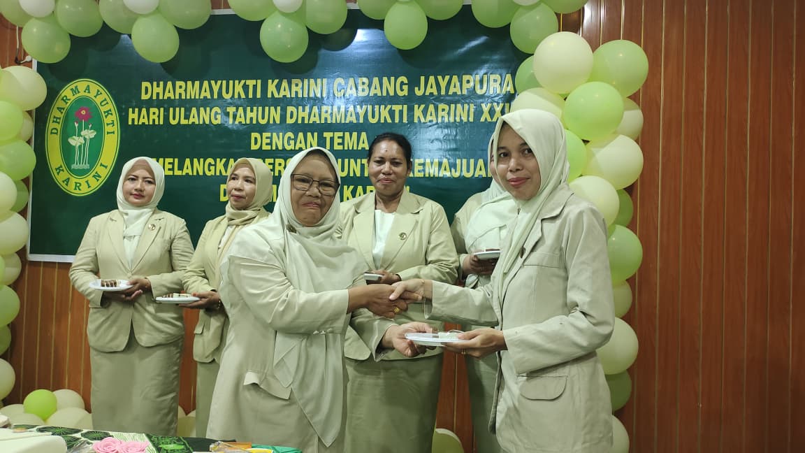 Sebagai bentuk rasa syukur dan kebersamaan, acara dilanjutkan dengan pemotongan tumpeng oleh para pelindung Dharmayukti Karini. Momen ini menjadi simbol rasa bersyukur atas kebersamaan yang terus terjalin harmonis. Suasana semakin hangat dengan pembagian cenderamata bagi anggota purna bakti sebagai bentuk penghargaan atas dedikasi dan pengabdian selama menjadi bagian dari keluarga besar Dharmayukti Karini. Tidak kalah meriah, acara ini juga dimeriahkan dengan pembagian hadiah lomba yang sebelumnya telah diselenggarakan untuk menambah keceriaan HUT Dharmayukti Karini. Rangkaian acara kemudian ditutup dengan penuh sukacita dan dilanjutkan dengan kegiatan arisan rutin Dharmayukti Karini yang menjadi momen santai bagi seluruh anggota untuk saling berbagi cerita dan mempererat hubungan kekeluargaan. Melalui kegiatan ini, diharapkan Dharmayukti Karini Cabang Jayapura terus tumbuh menjadi organisasi yang solid, harmonis dan senantiasa membawa manfaat bagi anggota maupun masyarakat di sekitar.