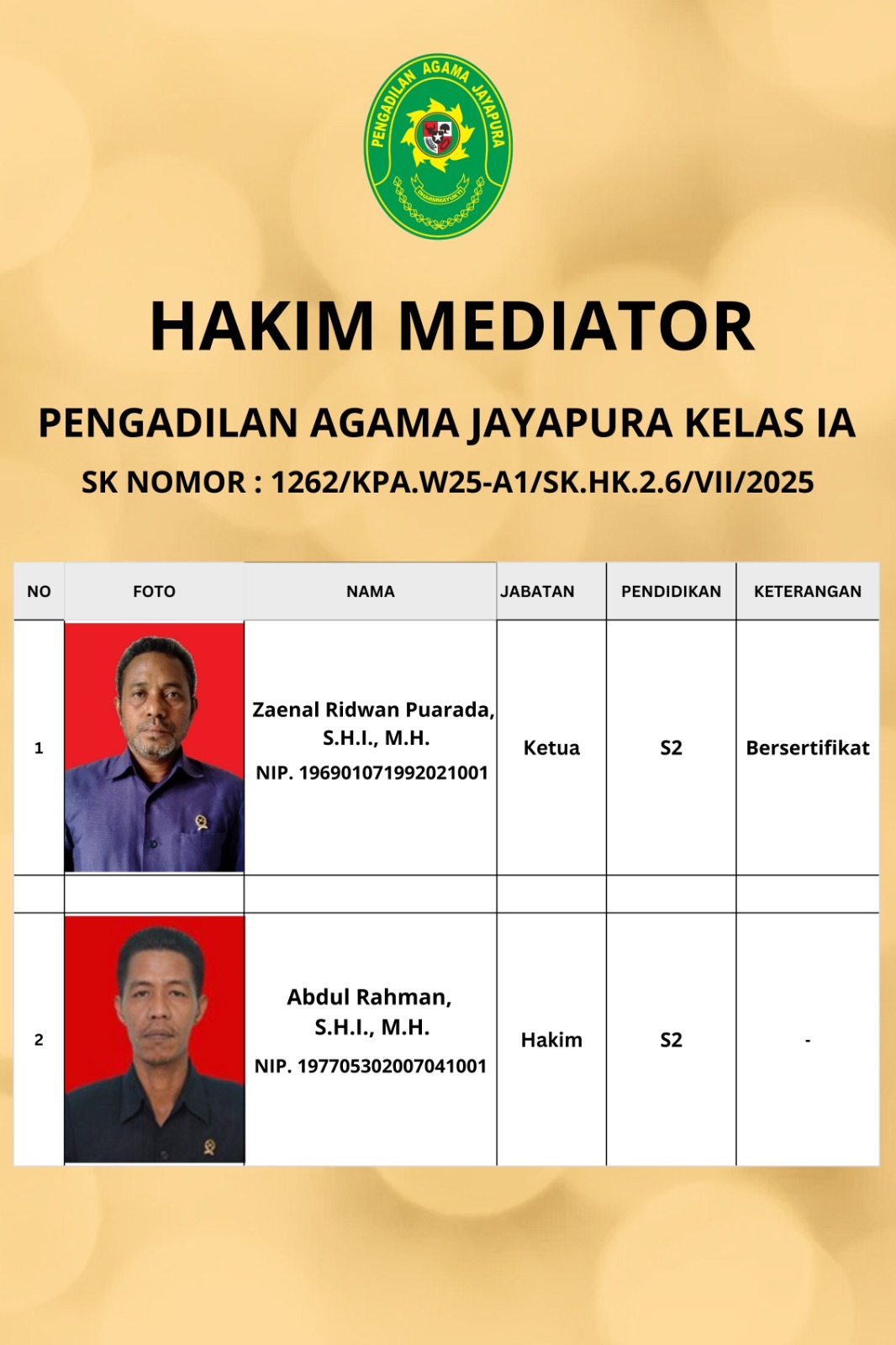 Surat Keputusan Ketua Pengadilan Agama Jayapura Kelas IA Nomor : 1262/KPA.W25-A1/HK2.6/VII/2025
