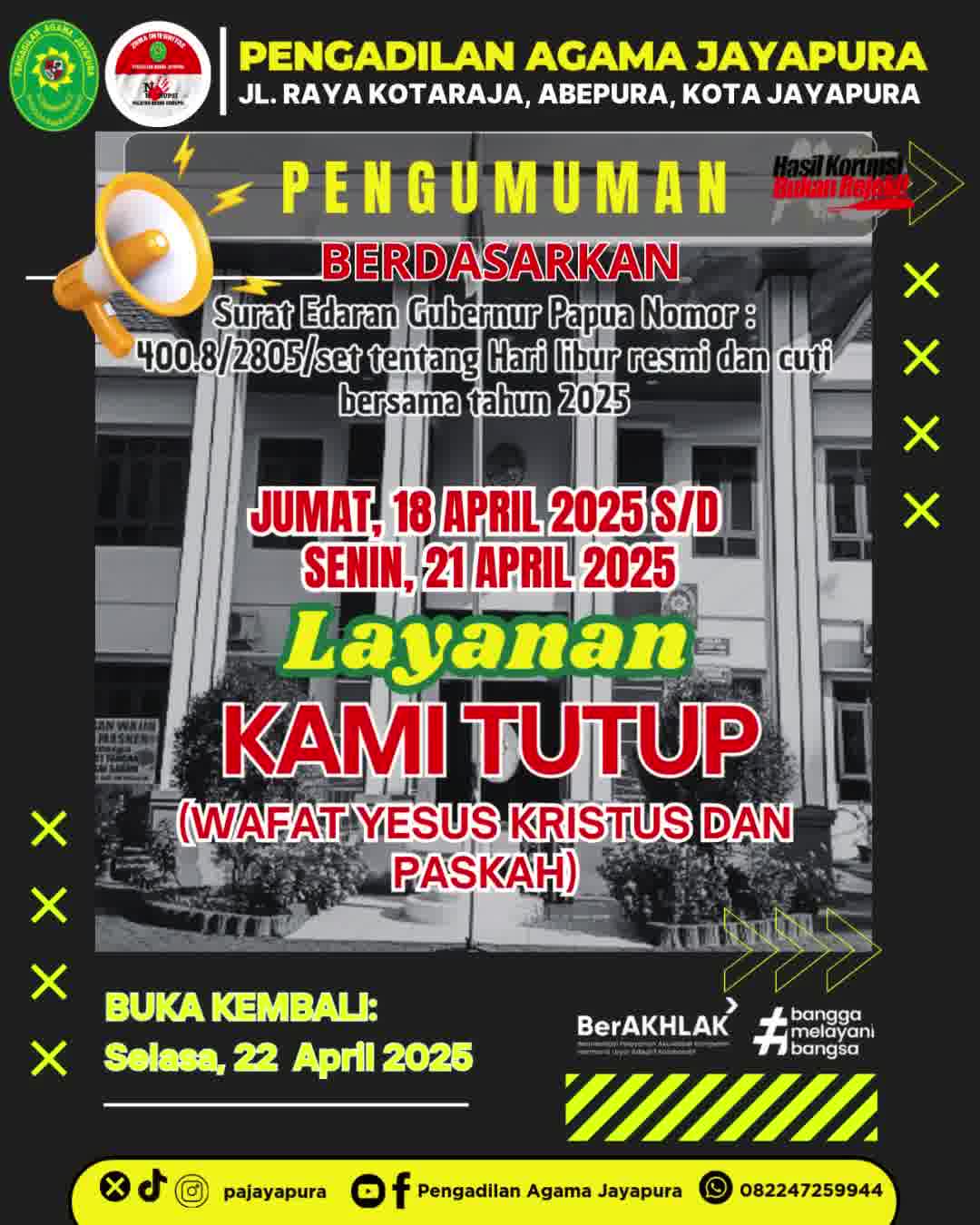Jumat, 18 April2025 s/d Senin, 21 April 2025 Layanan Kami TUTUP