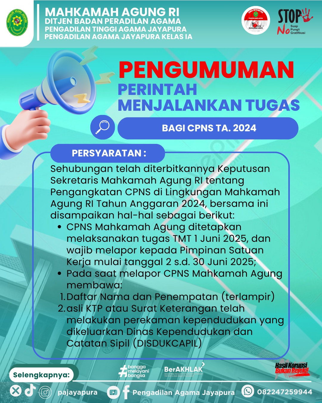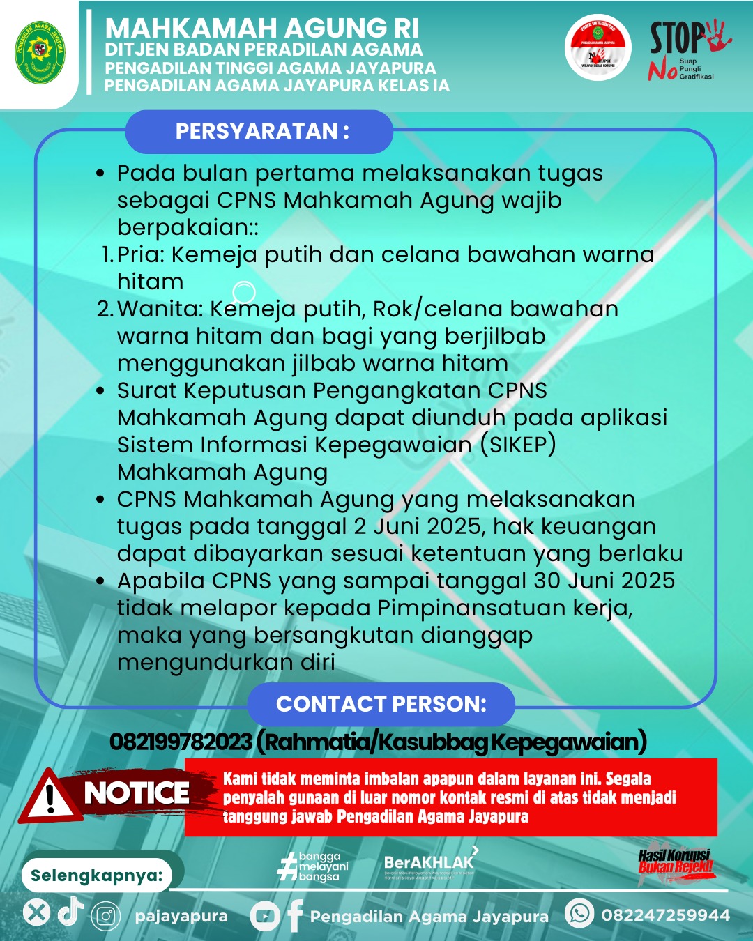 Kami tidak meminta imbalan apapun dalam layanan ini. Segala penyalah gunaan di luar nomor kontak resmi di atas tidak menjadi tanggung jawab Pengadilan Agama Jayapura.